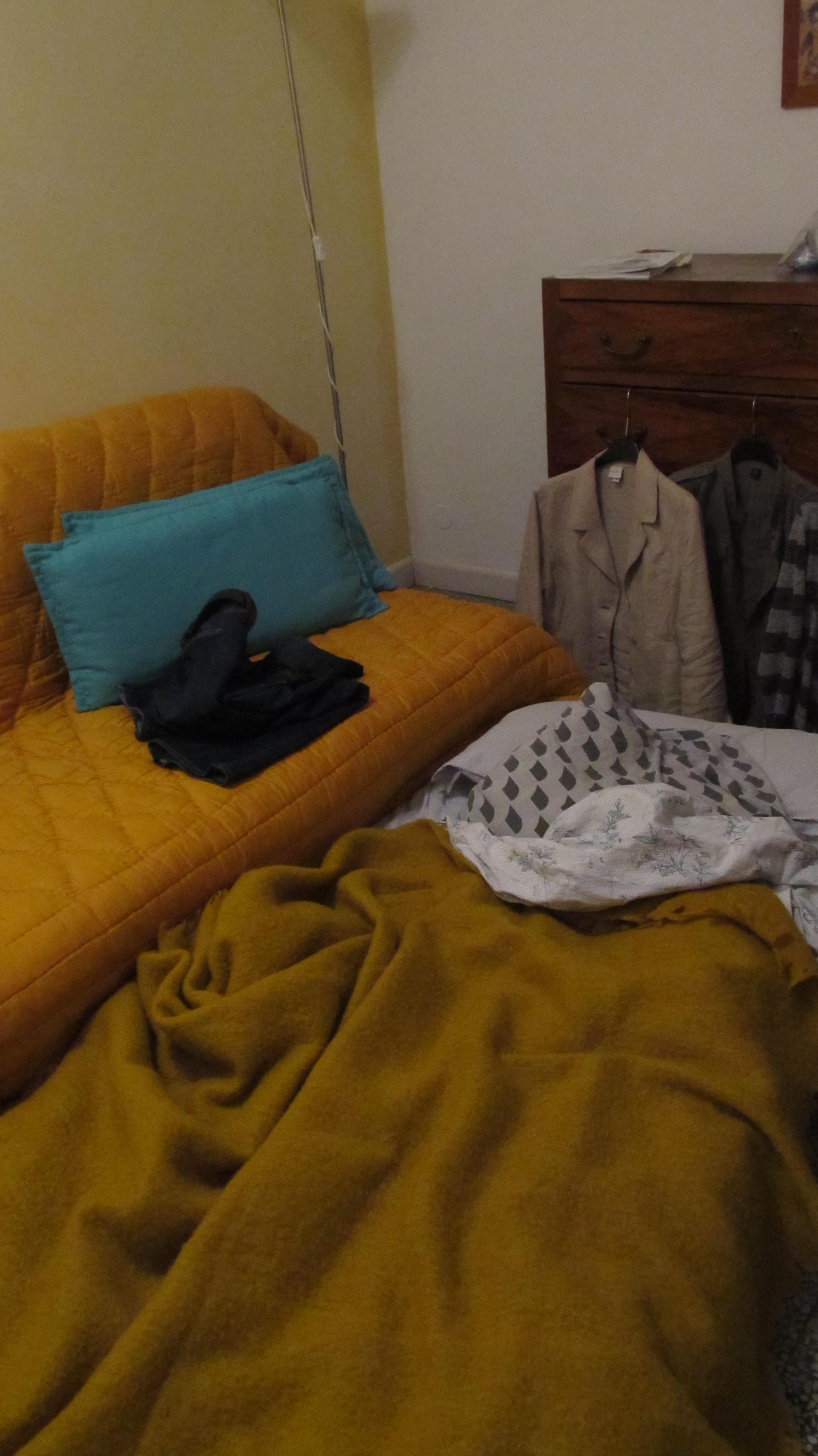 For the first two weeks in Bologna I was sleeping on the dirty floor of an American woman who shall remain nameless.  I could write for a day just about that experience, but will suffice with a photo of my quarters, below.  In sum, I learned many valuable lessons (I usually don’t fly by the seat of my pants for good reasons, you get what you pay for, never pay in full upfront, being a Buddhist about stuff is hard work, everything happens for a reason, yada yada).  During the first week I was actively searching for new accomodations and secured (sprung for) a solo apartment 2 minutes’ walk from the school starting after the second week.