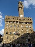 Looking at Palazzo Vecchio you see where Michelangelo’s David used to stand (and where a replica now stands).  There is also a replica of Hercules and Cacus by Bandinelli (symbolizing power [and?]).  While the original statues date from the 1500’s, the Palazzo was begun at the very end of the 13th century and was the seat of government and community affairs in Florence.  (You can still go there to wait in lines for official business to this day!).  Apparently when it was built, it was more practical – for instance, notice how small the windows on the bottom level are – it was built for protection, not beauty.  However, after the Medici family moved in during the Renaissance, they went about enlarging it, decorating it, and basically taking over.  Through this time it didn’t have a fancy name – just the town hall.  It became “Palazzo Vecchio,”  not because it’s really old (which it is now), but because the Medici decided to move down the road to Palazzo Pitti as their new home (thus this became their old “vecchio” one).