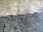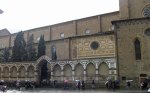 Santa Maria Novella (started in the 1200’s) is fairly well known as it is right across the street from the main train station which shares its name.  Therefore, most visitors to Florence have at least seen it from the outside (pics below of the front facade and folks outside the walls – and yes, it IS raining!).  I know I have often said how amazing the churches all over Europe are – and this one is no exception.  As a matter of fact, it is even more amazing because not only is there an enormous church decorated to the hilt, but an entire complex, complete with a cloister, smaller chapels and lots of tombs.  There is so much art and detail and interesting tombs that you could literally spend days exploring every nook and cranny of the complex.   There are the famous pieces – like Giotto’s Crucifix (1288-1289) and another Crucifix by Brunelleschi (1410 – 1415).  But even the not-so-famous stuff is pretty cool.  There are frescoes all along the walls in the cloister, as well as frescoes and tile work and more in all of the little prayer spaces and chapels throughout.  It’s pretty overwhelming how much work went into this place!  (Every time we see one of these churches we always marvel at how it was all accomplished before the days of forklifts and electric drills!)