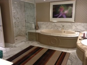 I think I’ve mentioned more than once that we took a road trip over Spring Break. We started off in Las Vegas, splurging with a great AAA rate for 2 nights at the Bellagio (I’ve always wanted to stay there). When I was checking us in, the concierge asked if we were there celebrating anything special, to which I responded (honestly), “Yes, our 24th Anniversary” (yes readers, you read that right, and THANK YOU, I do look too young). The nice young woman then disappeared for a few minutes and returned with the keys, telling us we had been complimentarily upgraded to a “suite.” Pretty cool, huh?! We didn’t know what “suite” meant till we got to the room – almost 1600 sf, 2 bathrooms, a living room, dining area and bar (pictured below). Now that’s a Las Vegas Suite!!!
