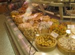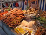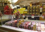 So, instead of quiche we “made do” with some buttery pain au chocolates from another local patisserie we passed on the way to the Metro.  We took the Metro to Galeries Lafayette, or, more specifically to the foodie floor, know as “Lafayette Gourmet.”  Not only is this market filled with upscale French and foreign groceries, but there are numerous counters selling freshly prepared food as well as little mini-restaurant stalls with tables to boot.  There’s all of the French food you can picture – from cheese to pastries to foie gras, and even a fish market/restaurant (as well as the foreign food I mentioned in a prior post).   Since you’ve probably figured out I’m a foodie and watch too many shows about food, then hopefully you won’t be too appalled when I tell you that hearing about foie gras all these years had gotten the best of my curiosity.  While I was photographing the foie gras stall I noticed that behind the counter there were very small samples on crackers….I spontaneously felt compelled to ask for one – this is Paris after all and a once-in-a-lifetime opportunity.   So, how was it you ask?  Since I grew up eating chopped liver, I’m used to and like the taste of liver (and hence Tuscan crostini which is topped with it)….it had the taste and consistency of liver-flavored butter (which either sounds delicious or disgusting, depending on your point of view).  While I was happy to have tried it, it’s nothing I ever need or want to eat again, so please no one gorge a duck on my account.