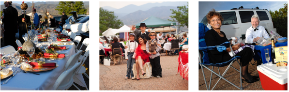So, as to the tailgating – this is a major tradition (you can read more about here) – everyone dressed in their finery gets to the venue a few hours early and sets up for dinner (anywhere from a cooler to an all out banquet table) – there is champagne, h’orderves, fancy food, etc. (you can also order dinner from the venue, as we did). It is a unique site for sure. We went semi-all out and brought a little table, fake flowers and some fake (i.e. dollar store plastic) “crystal.” Steve even brought a lawn-looking rug and an umbrella (which we needed as it started raining shortly after the picture, below, was taken). Here’s also some other folks (picture from the opera’s website):